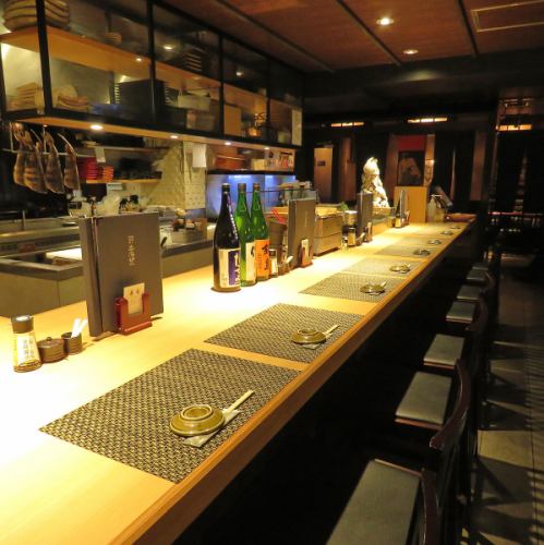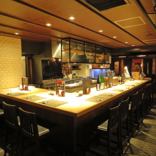 オープンキッチンを見渡せるカウンター席。お一人様も大歓迎!会社帰りの一杯に最適なお席です。